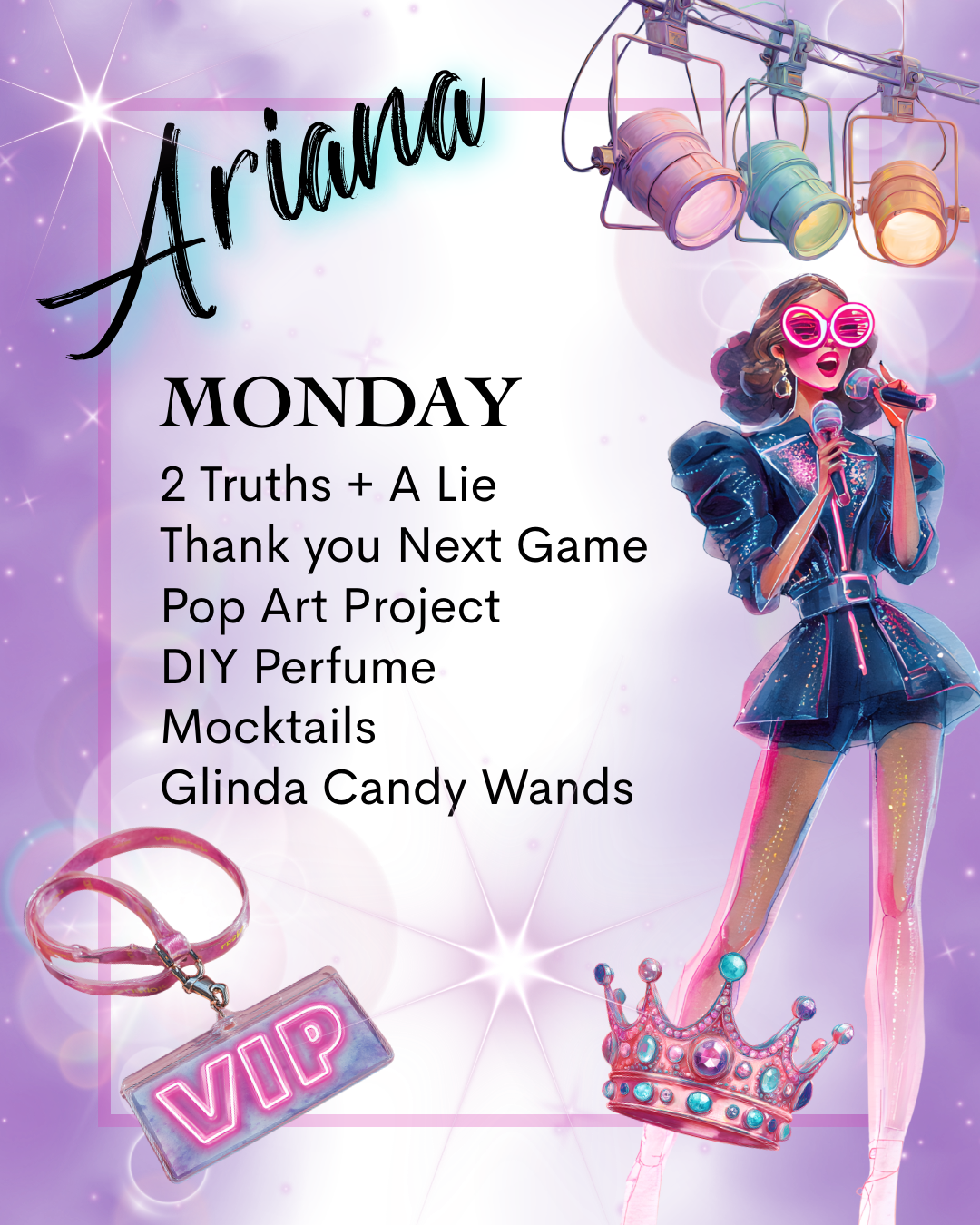 Each day is themed after a different queen of POP and filled with crafting, games, glitter and glam!