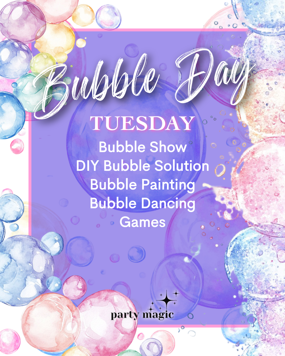 Day 2- Bubbles: Get ready to POP with fun as we immerse ourselves in a day full of bubbles! We will be doing everything from making take-home bubble solution and bubble painting to bubble dancing and games. End the day with a professional bubble show!