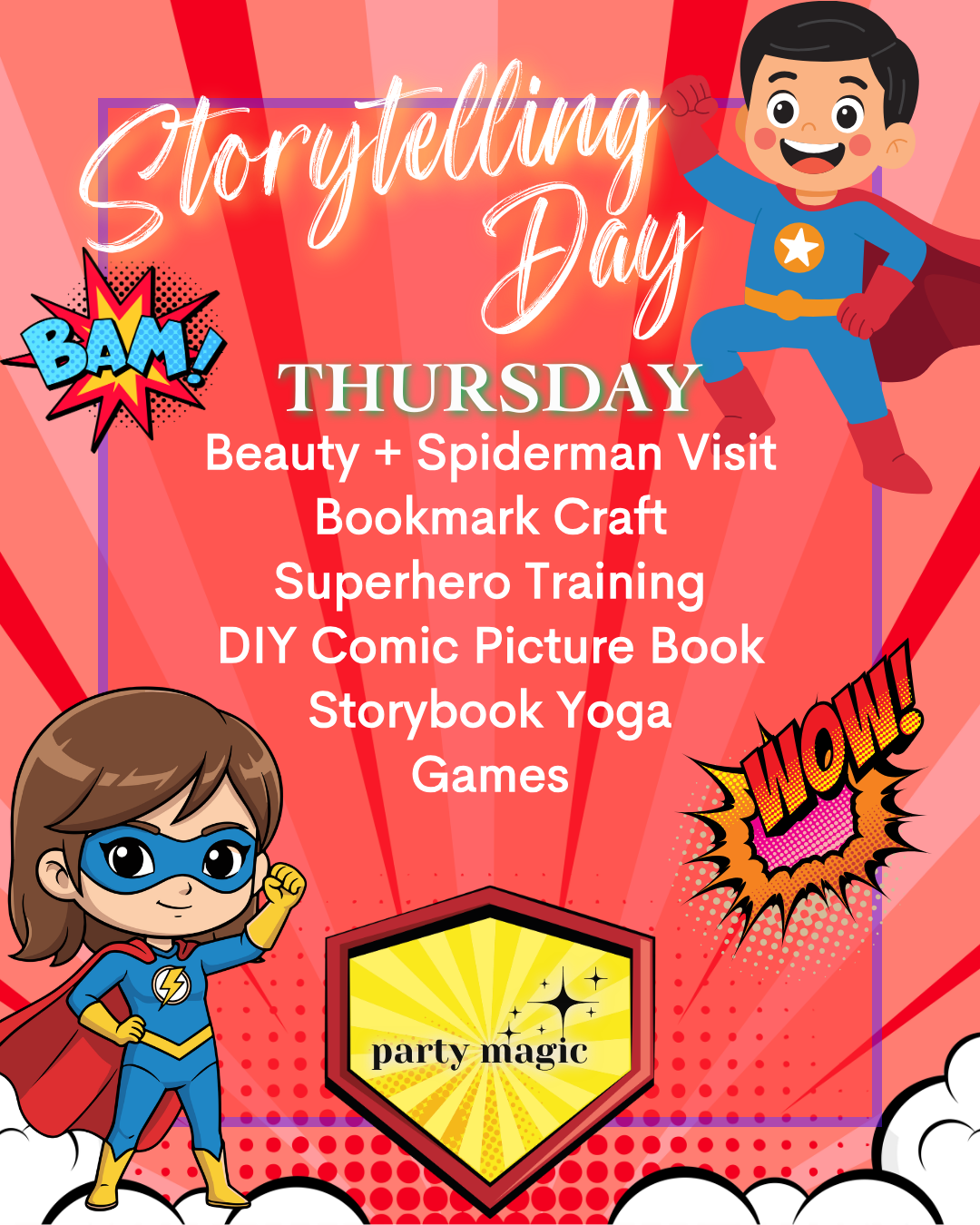 Day 4- Storytelling: Bring stories to life with interactive storytelling games, DIY comic style picture book making and storybook yoga. For our grand finale, welcome princess Beauty who will be making bookmarks with you and hero Spiderman who will be training everyone on how to be a real life hero!