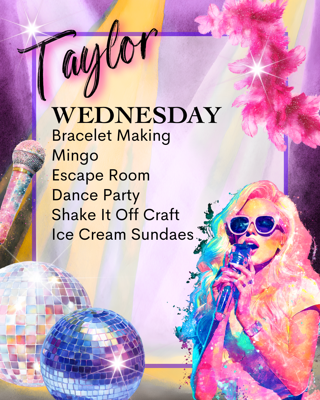 Day 3- Taylor: Bring out your inner showgirl with a day full of Taylor themed fun from bracelet making and diamond art to an escape room and dance party followed by ice cream sundaes and a Shake-It-Off craft.