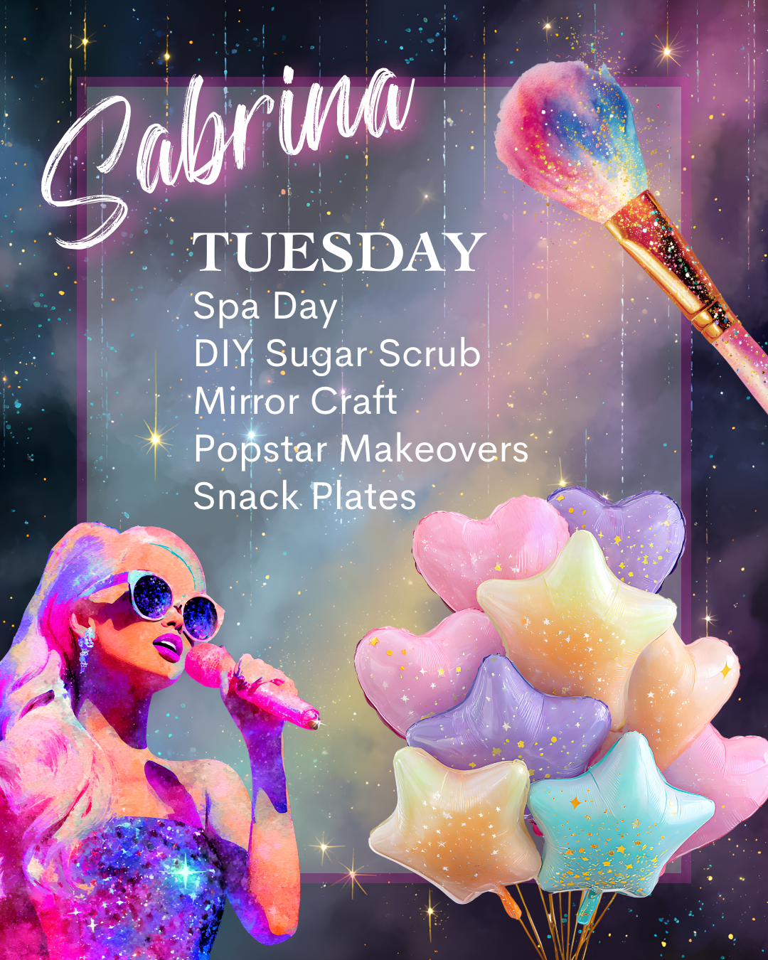 Day 2- Sabrina: Indulge in a full day of pampering with our signature spa activities, DIY sugar scrub, mirror craft, pop star makeovers, fancy snack plates and bubbly sips.