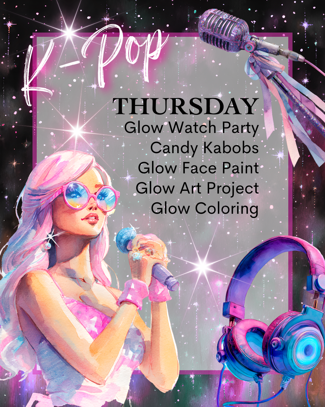 Day 4- Kpop: Put on your neon and get ready to GLOW during our Kpop watch party! We will be singing and dancing along with our favorite Kpop trio, applying our "patterns" with glow face paint, doing a glow art project, glow coloring and beading followed by candy kabob making all in our glow-in-the-dark party space.