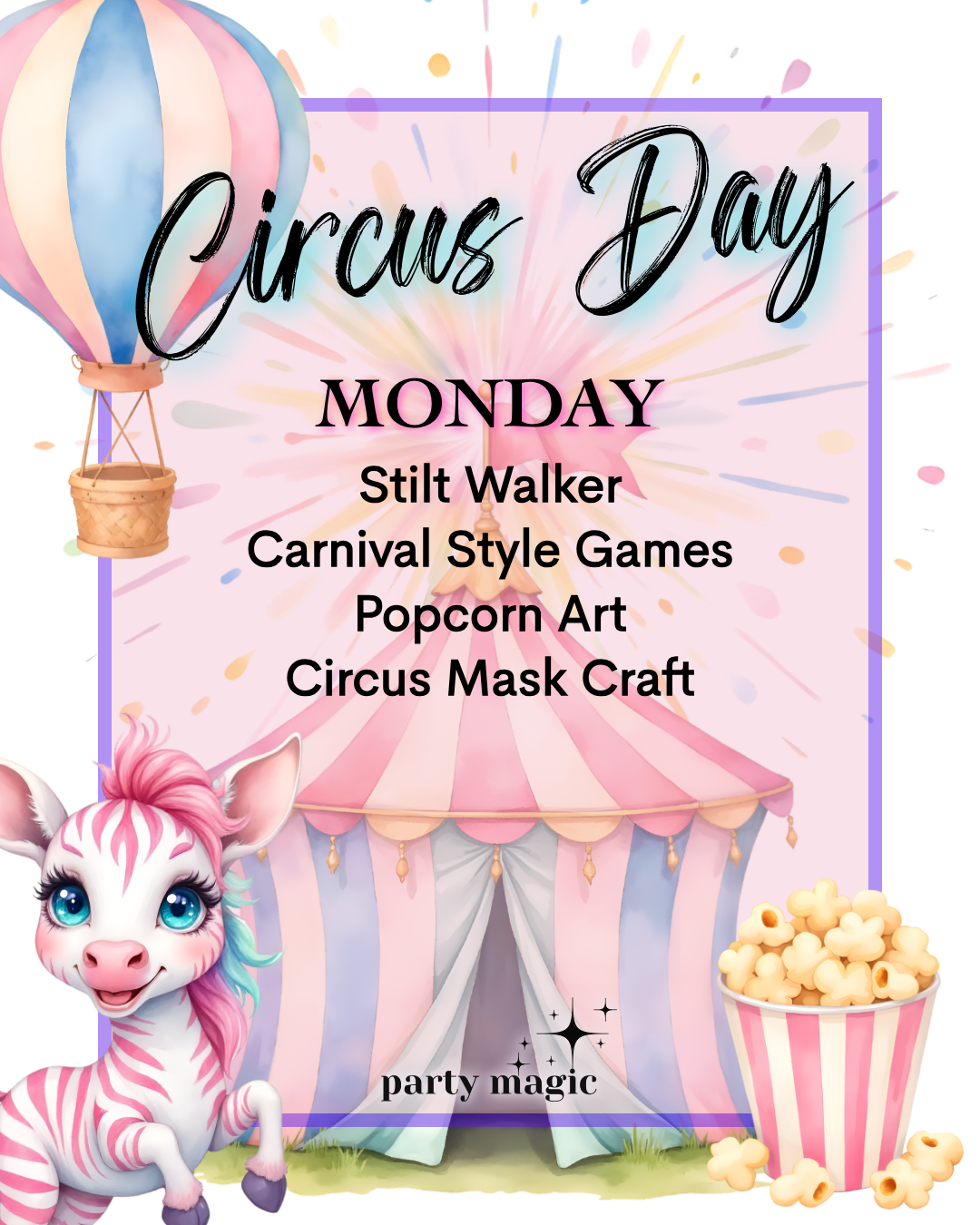 Day 1- Circus: Enter the world of the circus with carnival style games, animal masks, popcorn crafts, and a very special visit by a real life stilt walker.